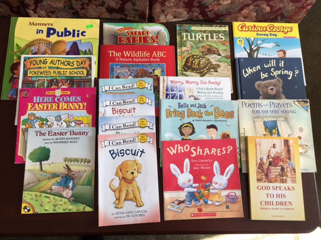 Hello to all of my fellow readers: Hopefully you have been able to while away the hours reading and re-reading the books you had on hand during the latest shut-down. Now that the church is open, we can once again safely resume the sale of used books – but not until Monday. There was a small leak in the back corner ceiling of the room where the books were displayed and about half of the books had to be boxed and moved to the hall. The books themselves did not receive any water damage – they had to be removed so that the workers could access the area. I took a box of children’s books home with me and took a picture of some of the cutest children’s books (pictured below). If there are any teachers or parents of young ones, these are available and waiting for a good home – waiting safely in a box in my home. Send me a line if any of these pique your interest.