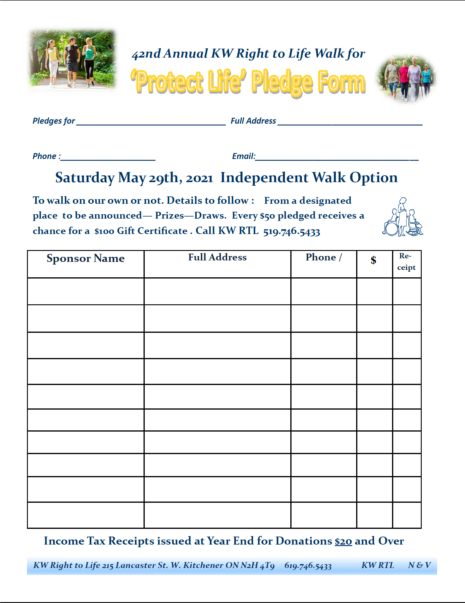 We hope you are enjoying the outdoors these fine days. The annual Walk for Life is May the 29th this year and has some changes from last year. We are walking this year but not together and are choosing our own distance to walk. There will be no gathering after at the RTL office due to shut-down provincial orders.
